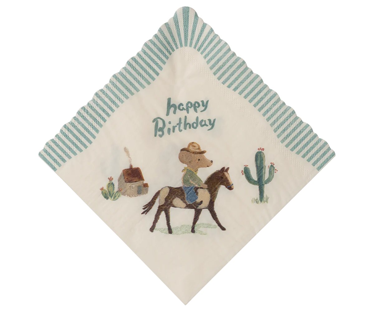 20 Servietten „Cowboy“. Dekoriere einen schönen Tisch mit diesen Papierservietten aus einer schönen, handgezeichneten Grafik von Dorthe Mailil. Jede Packung enthält 20 Servietten. Zusammengefaltet je ca. 15 x 15 cm groß.